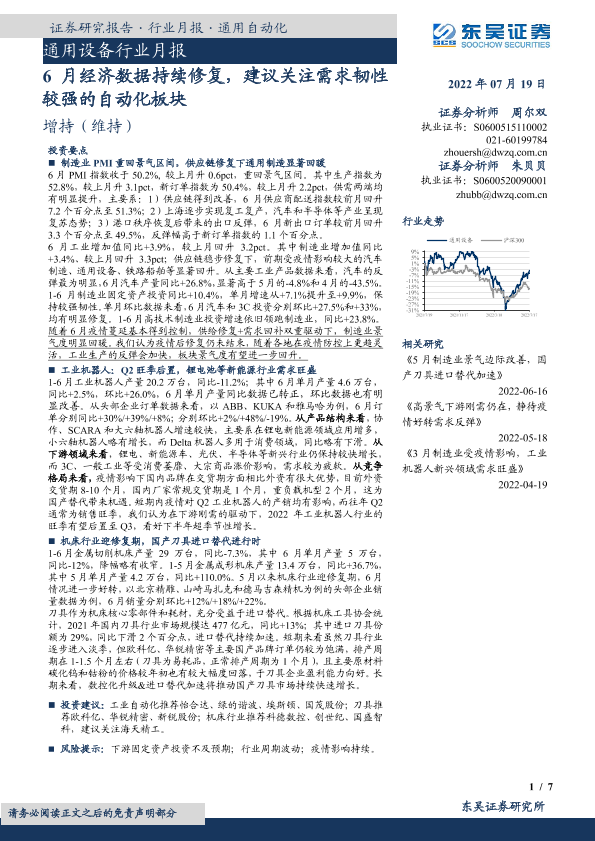 【东吴证券】【20220719】20220719-东吴证券-通用设备行业月报:6月经济数据持续修复,建议关注需求韧性较强的自动化板块-7页