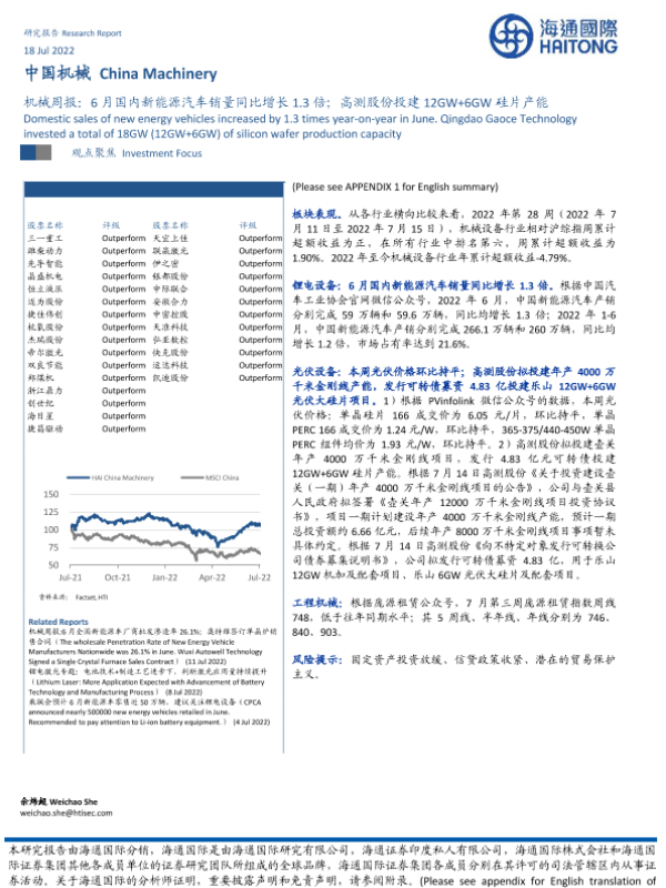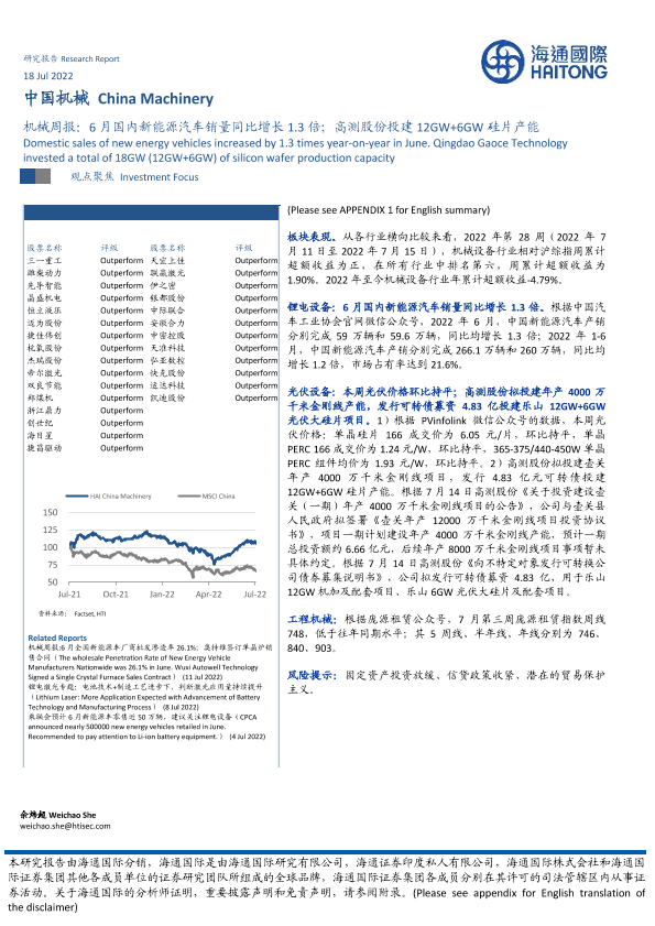 【海通国际】【20220718】机械周报:6月国内新能源汽车销量同比增长1.3倍;高测股份投建12GW+6GW硅片产能-15页