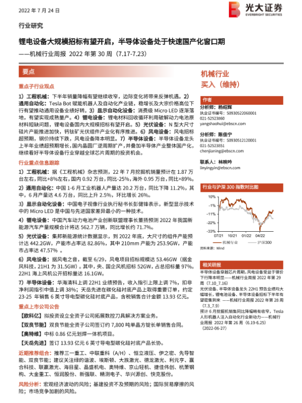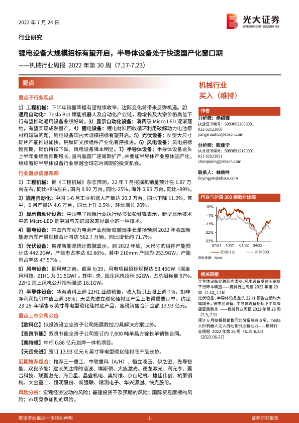 【光大证券】【20220724】机械行业周报2022年第30周:锂电设备大规模招标有望开启,半导体设备处于快速国产化窗口期-21页