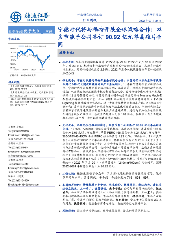 【海通证券】【20220724】20220724-海通证券-机械工业行业周报:宁德时代将与福特开展全球战略合作;双良节能子公司签订90.92亿元单晶硅片合同-8页