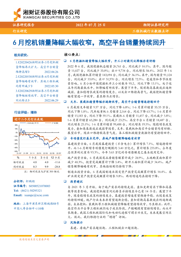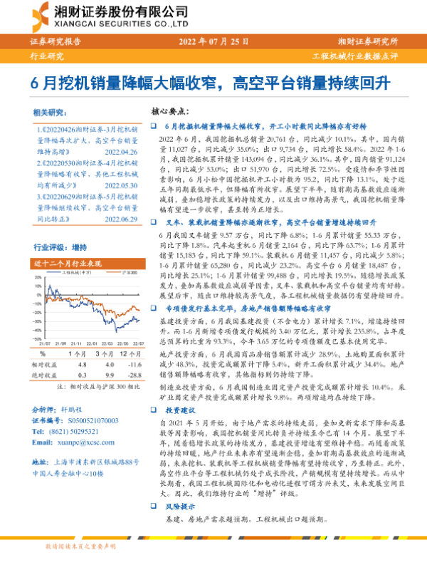 【湘财证券】【20220725】20220725-湘财证券-工程机械行业数据点评:6月挖机销量降幅大幅收窄,高空平台销量持续回升-9页