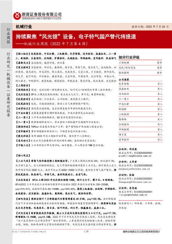【浙商证券】【20220724】机械行业周报(2022年7月第4周):持续聚焦“风光锂”设备,电子特气国产替代将提速-26页