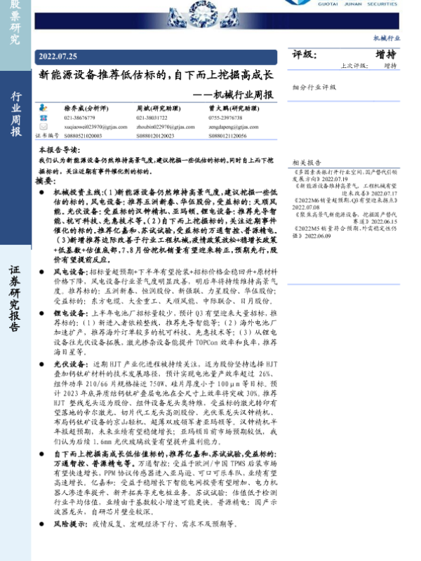 【国泰君安证券】【20220725】20220725-国泰君安-机械行业周报:新能源设备推荐低估标的,自下而上挖掘高成长-22页