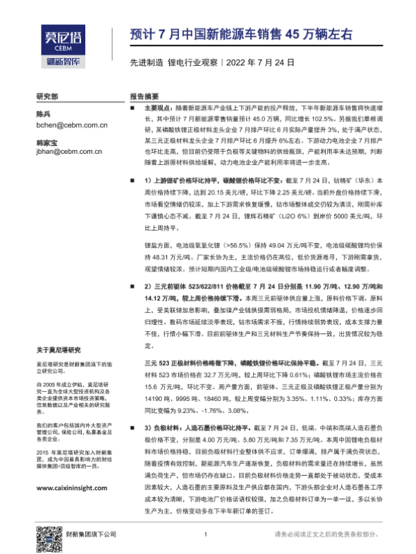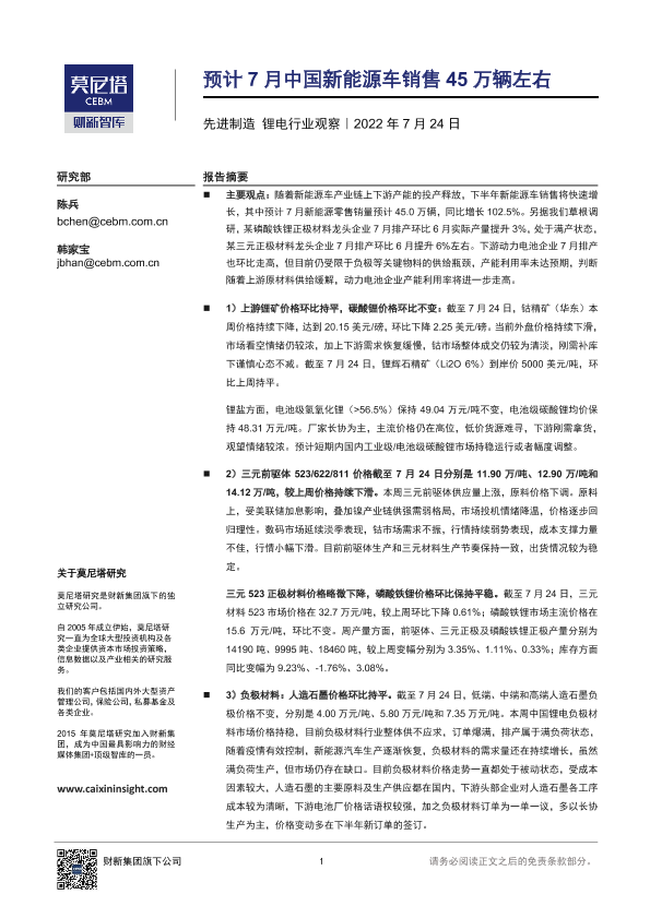 【莫尼塔研究】【20220724】先进制造锂电行业观察:预计7月中国新能源车销售45万辆左右-14页