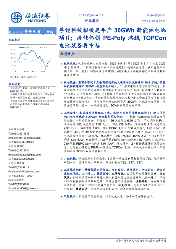 【海通证券】【20220807】20220807-海通证券-机械工业行业周报:孚能科技拟投建年产30GWh新能源电池项目;捷佳伟创PE-Poly路线TOPCon电池装备再中标-8页