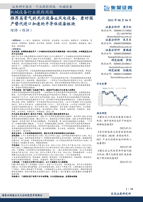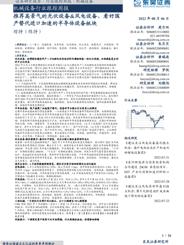 【东吴证券】【20220806】20220806-东吴证券-机械设备行业跟踪周报:推荐高景气的光伏设备&风电设备,看好国产替代进口加速的半导体设备板块-24页