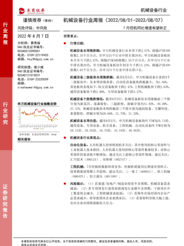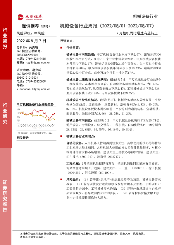 【东莞证券】【20220807】20220807-东莞证券-机械设备行业周报:7月挖机同比增速有望转正-11页