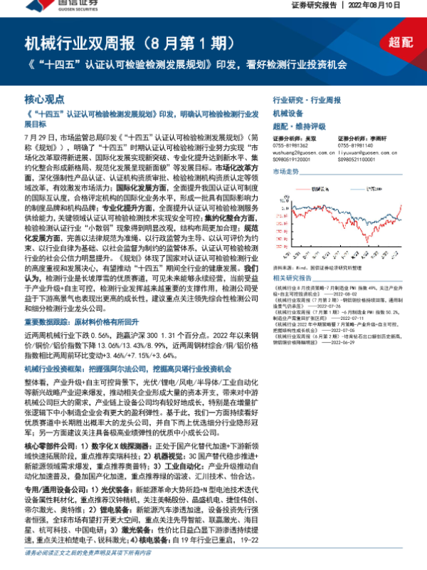 【国信证券】【20220810】20220810-国信证券-机械行业双周报(8月第1期):《“十四五”认证认可检验检测发展规划》印发,看好检测行业投资机会-27页