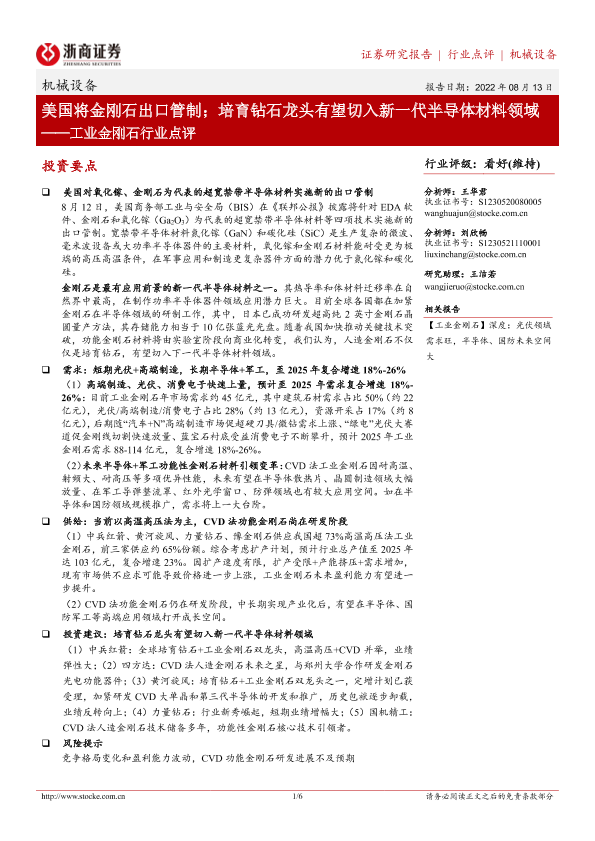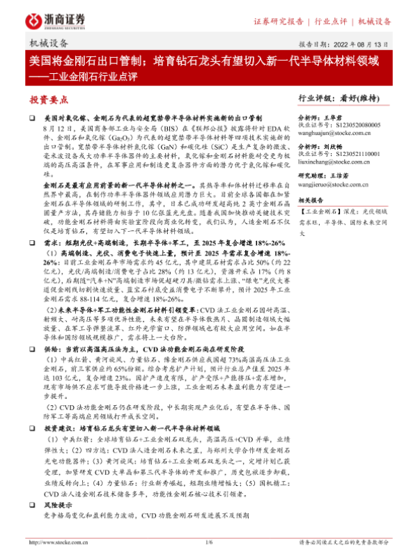 【浙商证券】【20220813】20220813-浙商证券-工业金刚石行业点评:美国将金刚石出口管制;培育钻石龙头有望切入新一代半导体材料领域-6页