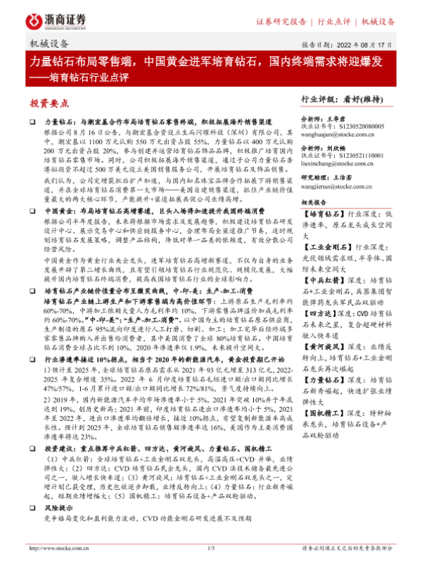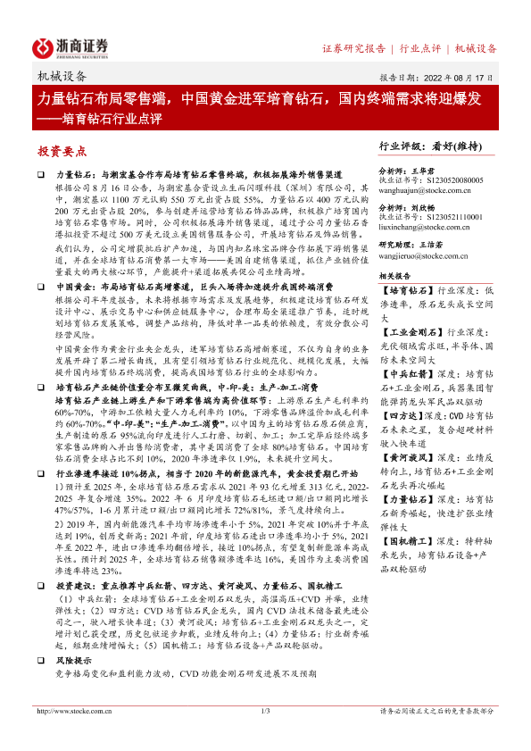 【浙商证券】【20220817】20220817-浙商证券-培育钻石行业点评:力量钻石布局零售端,中国黄金进军培育钻石,国内终端需求将迎爆发-3页