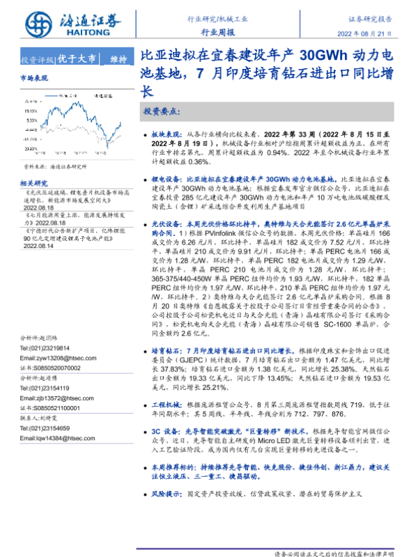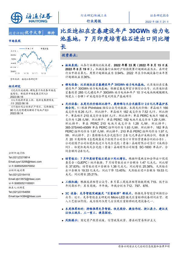 【海通证券】【20220821】20220821-海通证券-机械工业行业周报:比亚迪拟在宜春建设年产30GWh动力电池基地,7月印度培育钻石进出口同比增长-8页