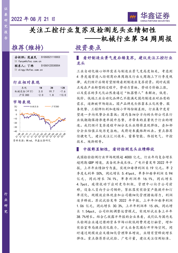 【华鑫证券】【20220821】机械行业第34周周报:关注工控行业复苏及检测龙头业绩韧性-25页