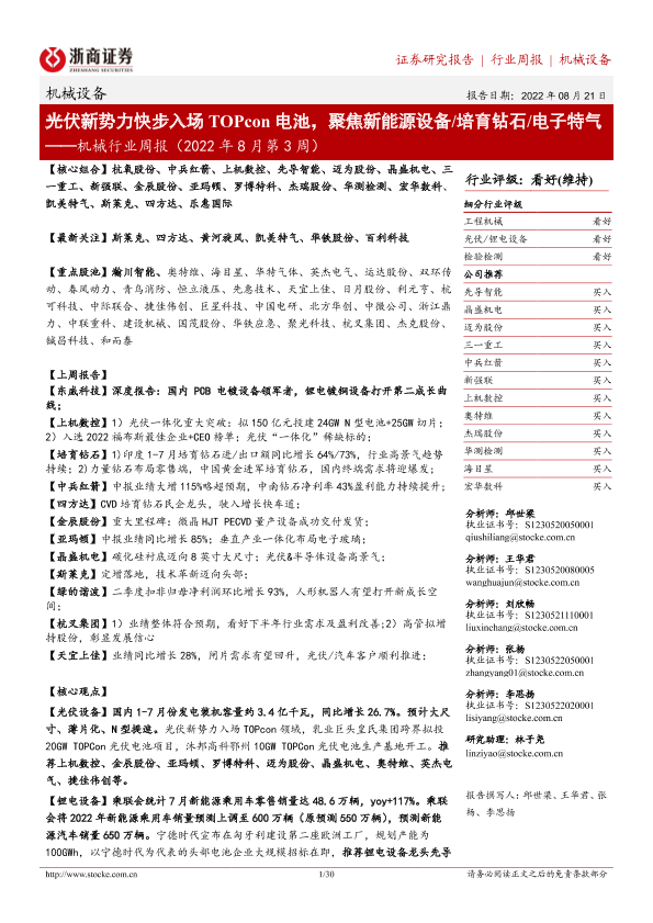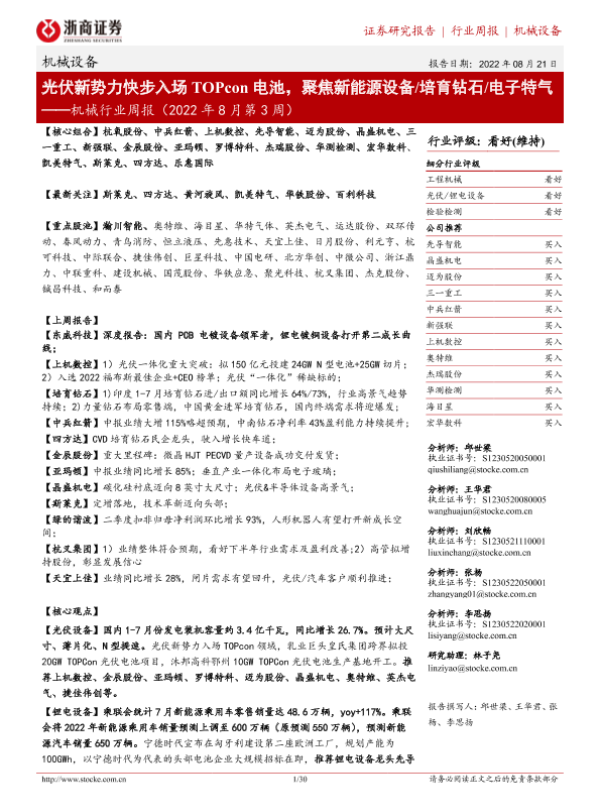 【浙商证券】【20220821】机械行业周报(2022年8月第3周):光伏新势力快步入场TOPcon电池,聚焦新能源设备 培育钻石 电子特气-30页