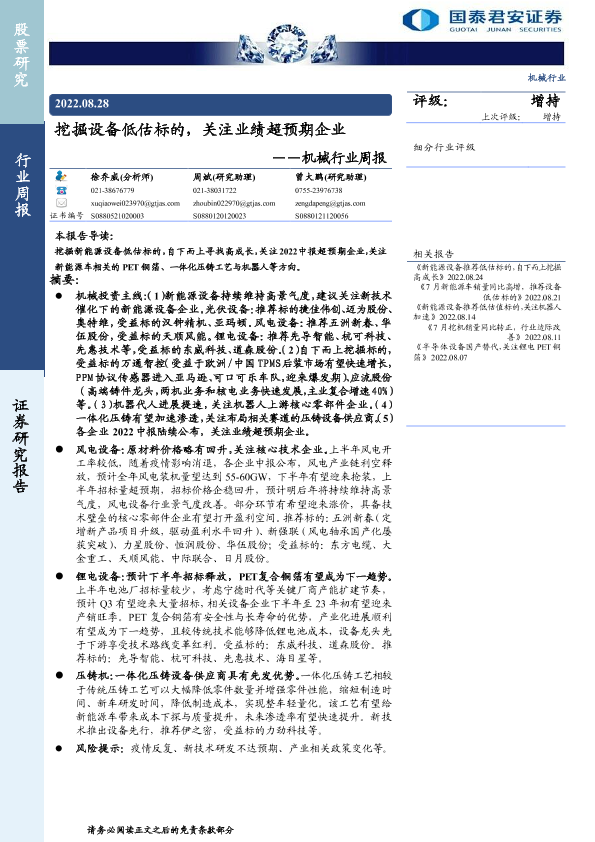 【国泰君安证券】【20220828】20220828-国泰君安-机械行业周报:挖掘设备低估标的,关注业绩超预期企业-35页