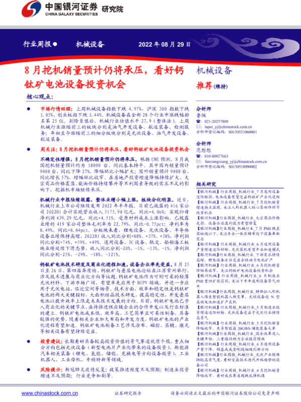 【银河证券】【20220829】20220829-中国银河-机械设备行业周报:8月挖机销量预计仍将承压,看好钙钛矿电池设备投资机会-19页