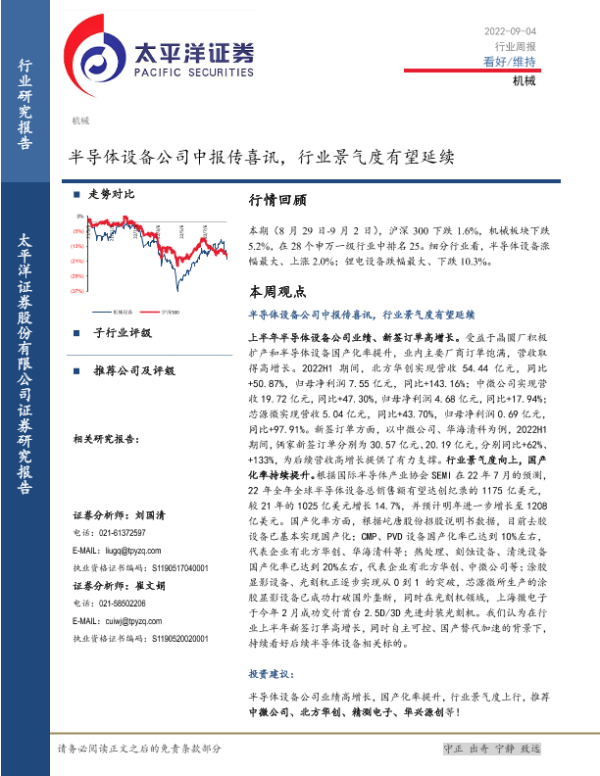 【太平洋证券】【20220904】20220904-太平洋-机械行业周报:半导体设备公司中报传喜讯,行业景气度有望延续-13页