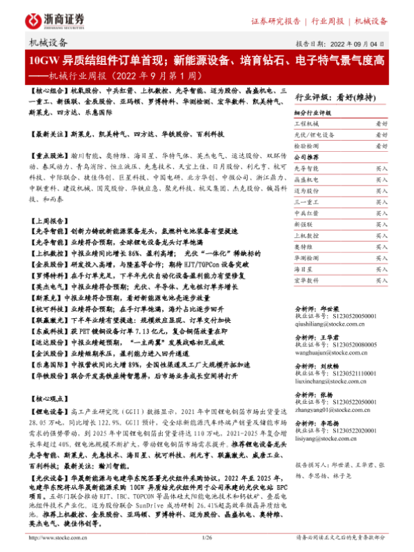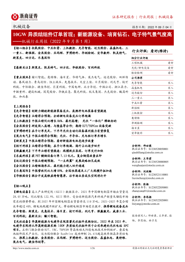 【浙商证券】【20220904】机械行业周报(2022年9月第1周):10GW异质结组件订单首现;新能源设备、培育钻石、电子特气景气度高-26页