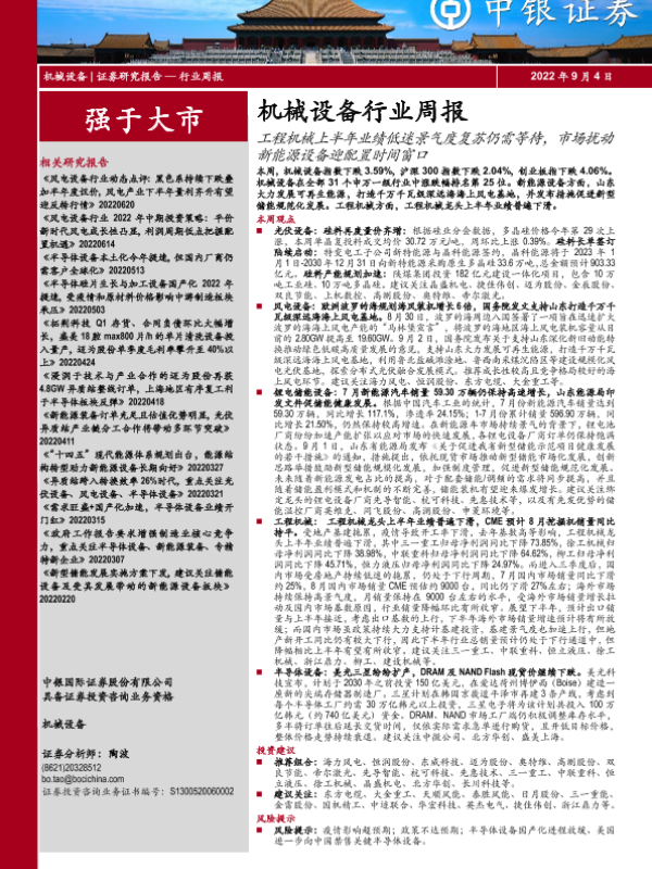 【中银证券】【20220904】20220904-中银证券-机械设备行业周报:工程机械上半年业绩低迷景气度复苏仍需等待,市场扰动新能源设备迎配置时间窗口-15页