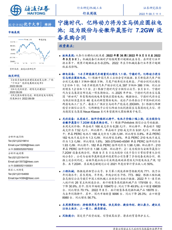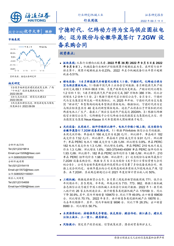 【海通证券】【20220911】20220911-海通证券-机械工业行业周报:宁德时代、亿纬动力将为宝马供应圆柱电池;迈为股份与安徽华晟签订7.2GW设备采购合同-8页