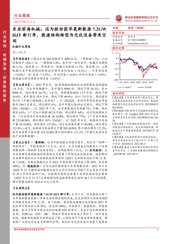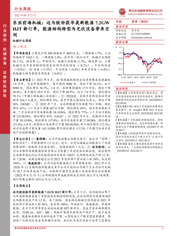 【东亚前海证券】【20220912】20220912-东亚前海证券-机械行业周报:迈为股份获华晟新能源7.2GWHJT新订单,能源结构转型为光伏设备带来空间-23页