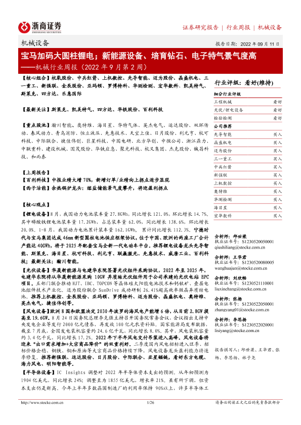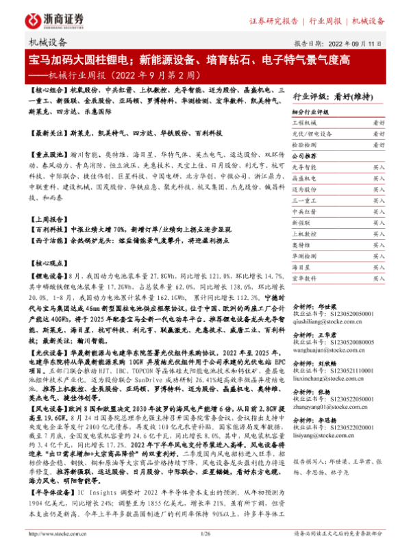 【浙商证券】【20220911】机械行业周报(2022年9月第2周):宝马加码大圆柱锂电;新能源设备、培育钻石、电子特气景气度高-26页
