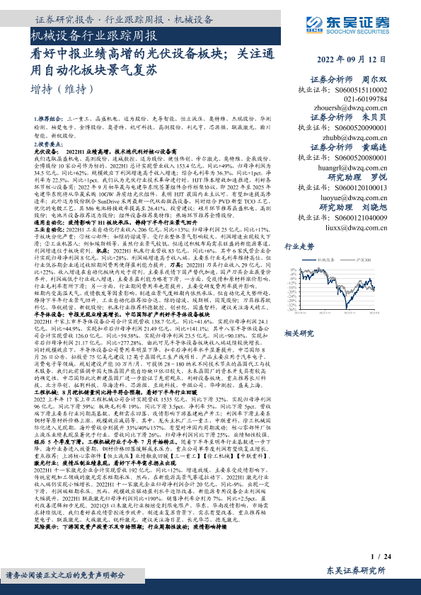 【东吴证券】【20220912】20220912-东吴证券-机械设备行业跟踪周报:看好中报业绩高增的光伏设备板块;关注通用自动化板块景气复苏-24页