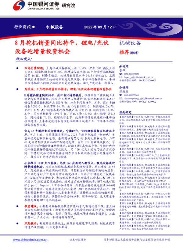 【银河证券】【20220912】20220912-中国银河-机械设备行业周报:8月挖机销量同比持平,锂电/光伏设备迎增量投资机会-20页