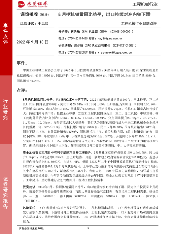 【东莞证券】【20220913】20220913-东莞证券-工程机械行业跟踪点评:8月挖机销量同比持平,出口持续对冲内销下滑-3页
