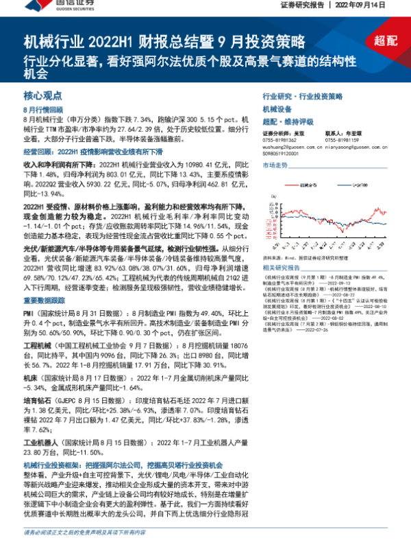 【国信证券】【20220914】机械行业2022H1财报总结暨9月投资策略:行业分化显著,看好强阿尔法优质个股及高景气赛道的结构性机会-30页