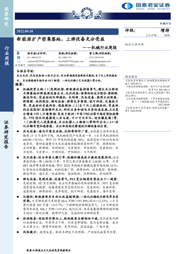 【国泰君安证券】【20220918】20220918-国泰君安-机械行业周报:新能源扩产密集落地,上游设备充分受益-32页