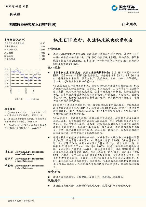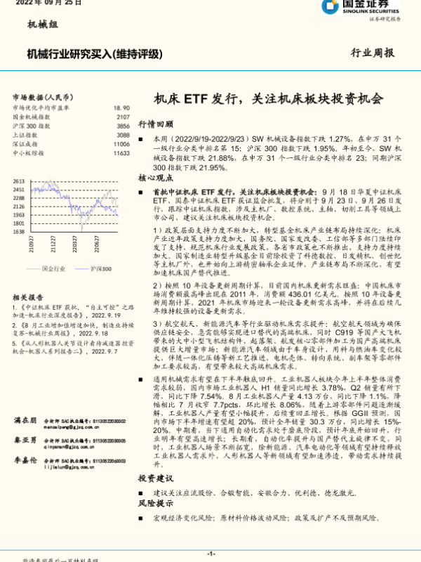 【国金证券】【20220925】20220925-国金证券-机械行业研究:机床ETF发行,关注机床板块投资机会-18页