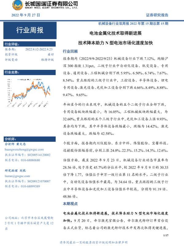 【长城国瑞证券】【20220927】机械设备行业双周报2022年第15期总第15期:电池金属化技术取得新进展 技术降本助力N型电池市场化速度加快-17页