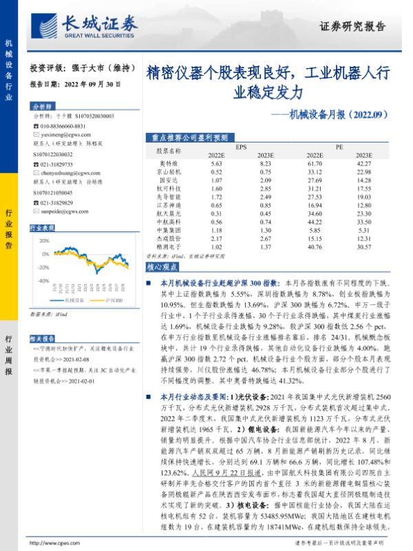 【长城证券】【20220930】20220930-长城证券-机械设备月报:精密仪器个股表现良好,工业机器人行业稳定发力-19页