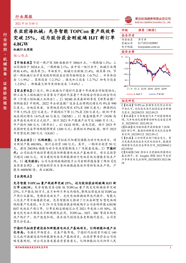 【东亚前海证券】【20221009】东亚前海机械行业周报:先导智能TOPCon量产线效率突破25%,迈为股份获金刚玻璃HJT新订单4.8GW-24页