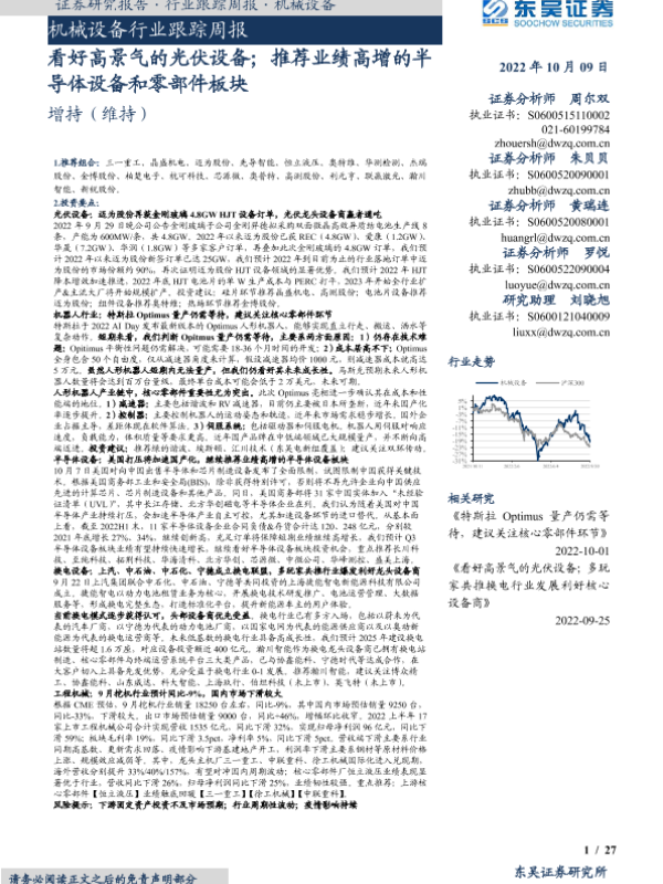 【东吴证券】【20221009】20221009-东吴证券-机械设备行业跟踪周报:看好高景气的光伏设备;推荐业绩高增的半导体设备和零部件板块-27页