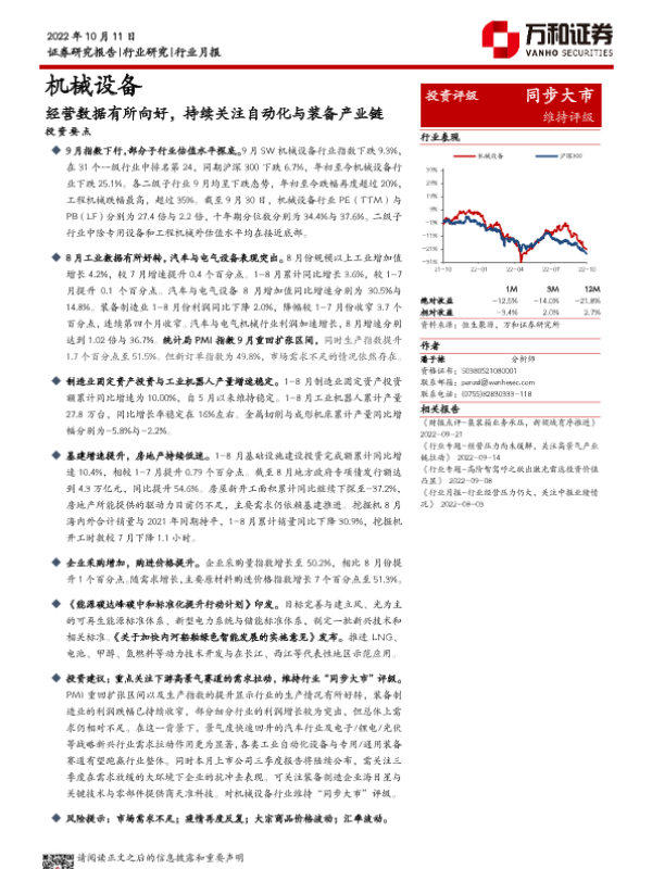 【万和证券】【20221011】20221011-万和证券-机械设备行业月报:经营数据有所向好,持续关注自动化与装备产业链-11页