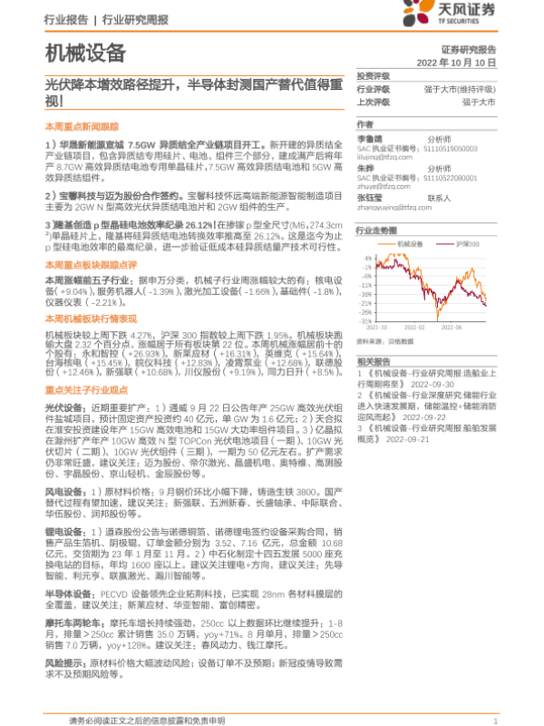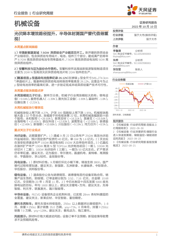 【天风证券】【20221010】机械设备行业研究周报:光伏降本增效路径提升,半导体封测国产替代值得重视!-13页