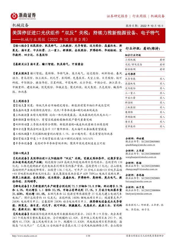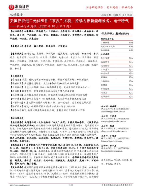 【浙商证券】【20221015】机械行业周报(2022年10月第3周):美国停征进口光伏组件“双反”关税;持续力推新能源设备、电子特气-30页