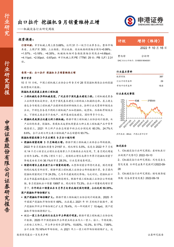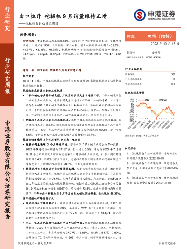 【申港证券】【20221016】20221016-申港证券-机械设备行业研究周报:出口拉升 挖掘机9月销量维持正增-13页