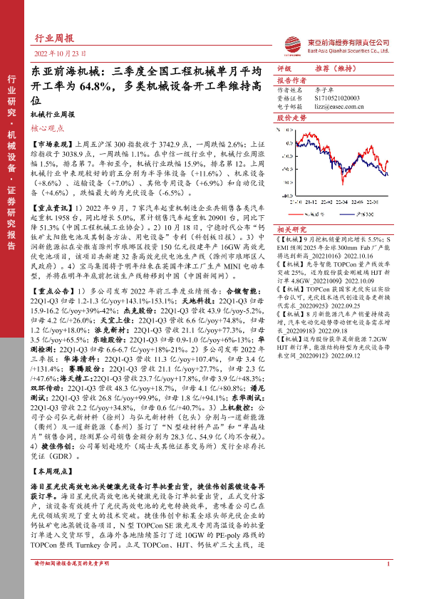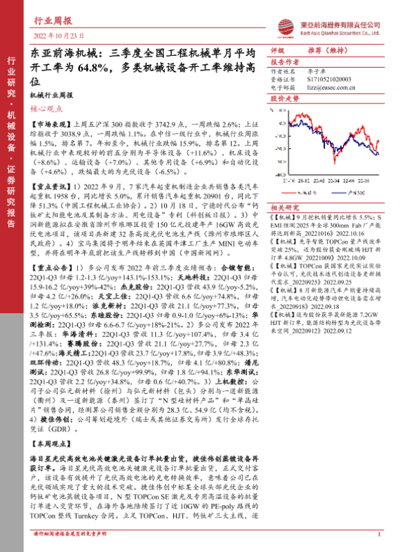 【东亚前海证券】【20221023】20221023-东亚前海证券-机械行业周报:三季度全国工程机械单月平均开工率为64.8%,多类机械设备开工率维持高位-24页