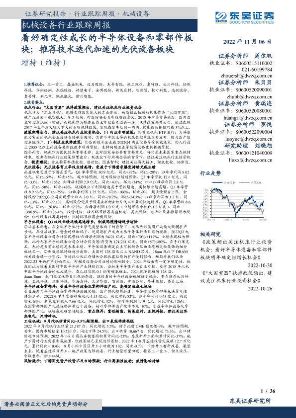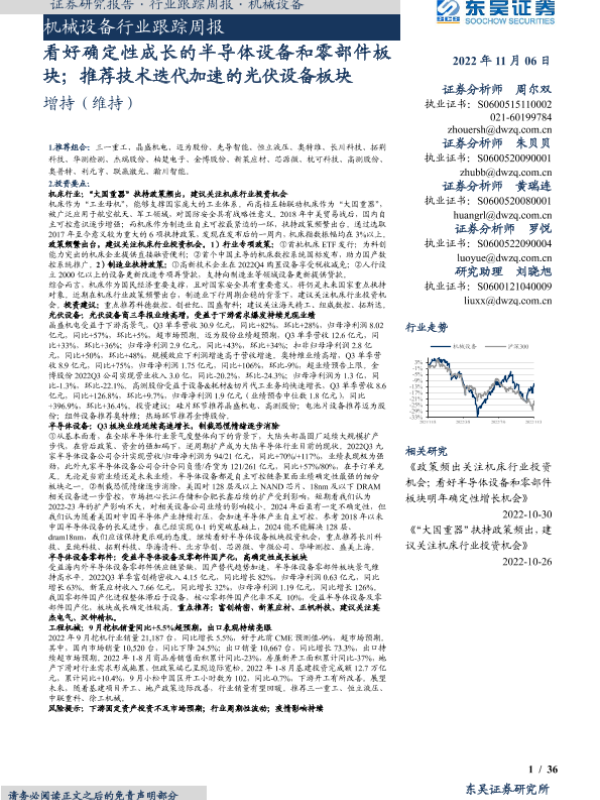 【东吴证券】【20221106】20221106-东吴证券-机械设备行业跟踪周报:看好确定性成长的半导体设备和零部件板块;推荐技术迭代加速的光伏设备板块-36页