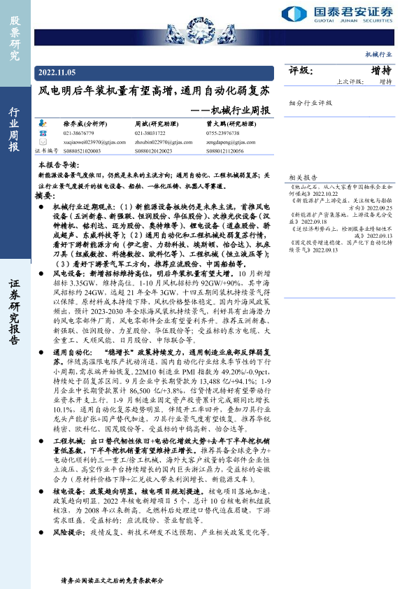 【国泰君安证券】【20221105】20221105-国泰君安-机械行业周报:风电明后年装机量有望高增,通用自动化弱复苏-38页