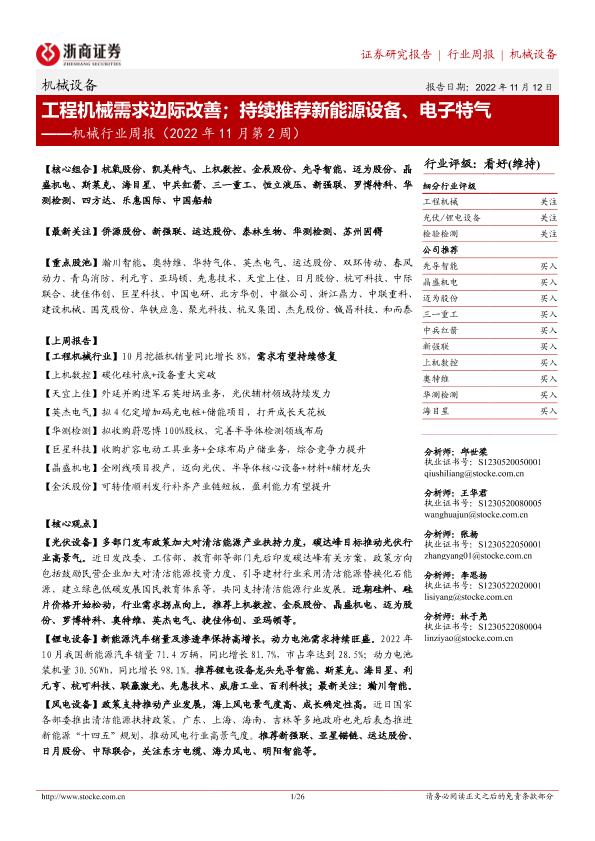 【浙商证券】【20221112】机械行业周报(2022年11月第2周):工程机械需求边际改善;持续推荐新能源设备、电子特气-26页