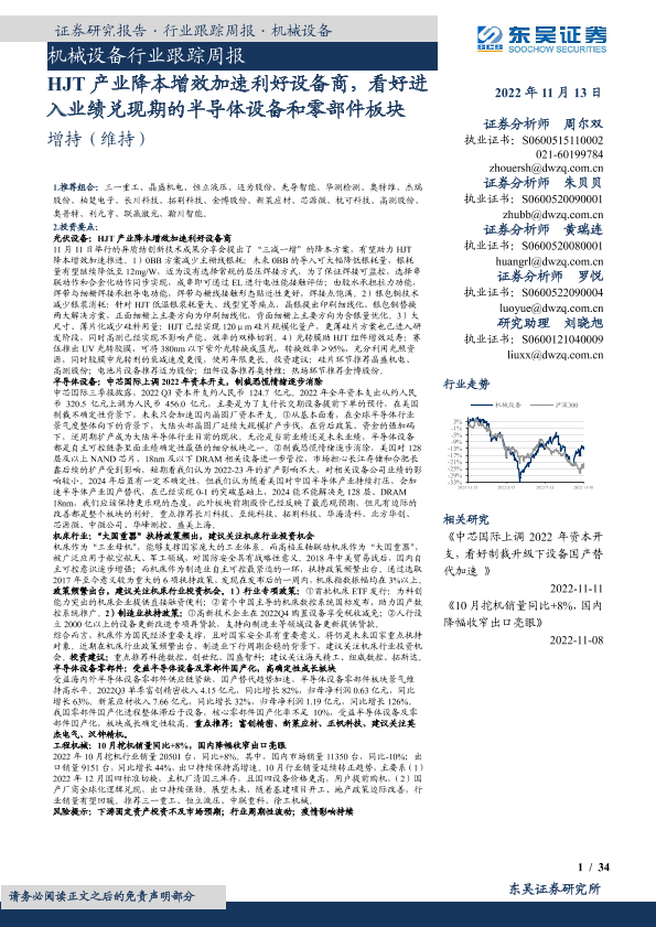 【东吴证券】【20221113】20221113-东吴证券-机械设备行业跟踪周报:HJT产业降本增效加速利好设备商,看好进入业绩兑现期的半导体设备和零部件板块-34页
