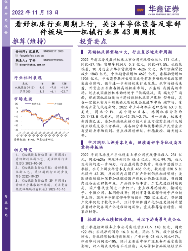 【华鑫证券】【20221113】20221113-华鑫证券-机械行业第43周周报:看好机床行业周期上行,关注半导体设备及零部件板块-24页