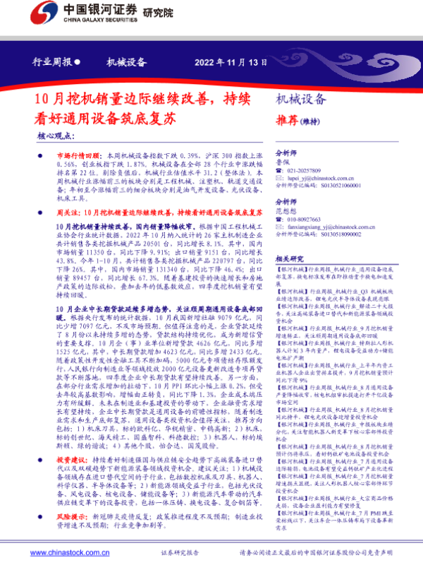 【银河证券】【20221113】20221113-中国银河-机械设备行业周报:10月挖机销量边际继续改善,持续看好通用设备筑底复苏-19页