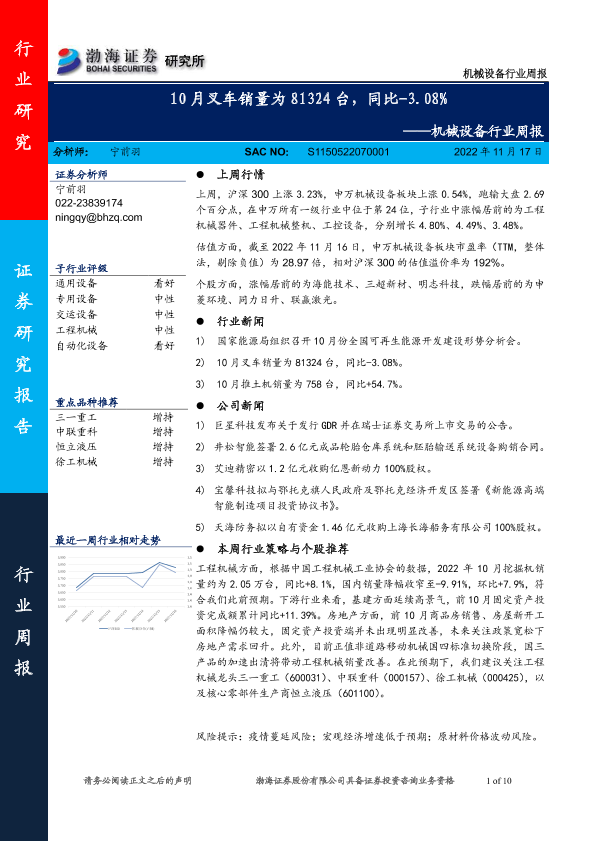 【渤海证券】【20221117】20221117-渤海证券-机械设备行业周报:10月叉车销量为81324台,同比-3.08%-10页