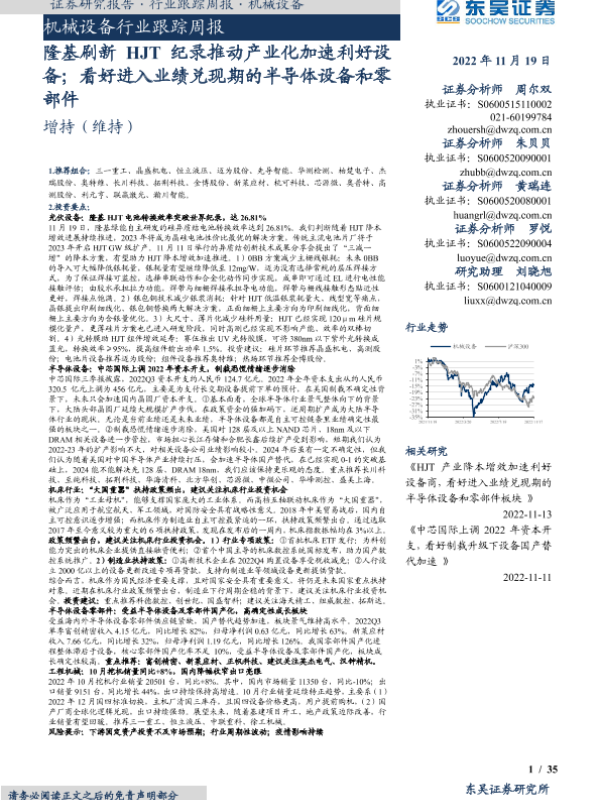 【东吴证券】【20221119】20221119-东吴证券-机械设备行业跟踪周报:隆基刷新HJT纪录推动产业化加速利好设备;看好进入业绩兑现期的半导体设备和零部件-35页
