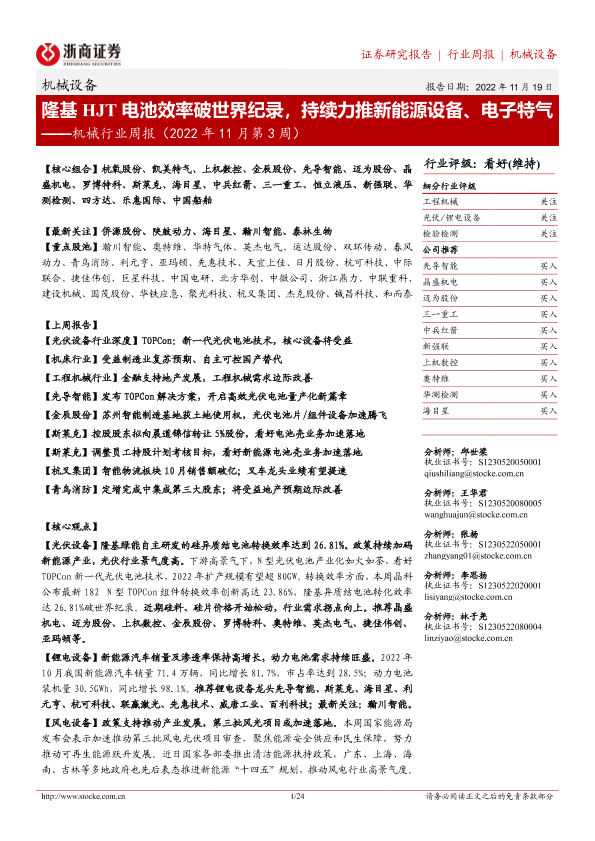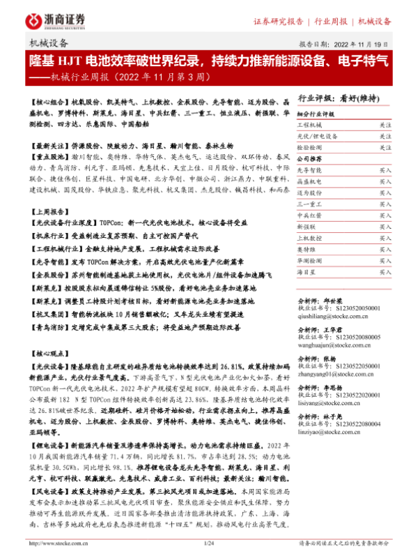 【浙商证券】【20221119】2022年11月第3周机械行业周报:隆基HJT电池效率破世界纪录,持续力推新能源设备、电子特气-24页