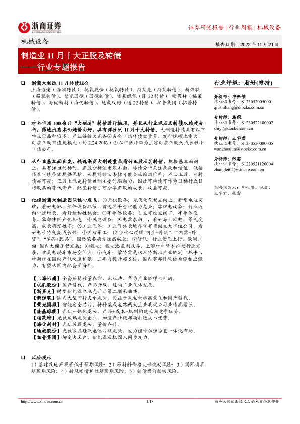 【浙商证券】【20221121】20221121-浙商证券-机械设备行业专题报告:制造业11月十大正股及转债-18页